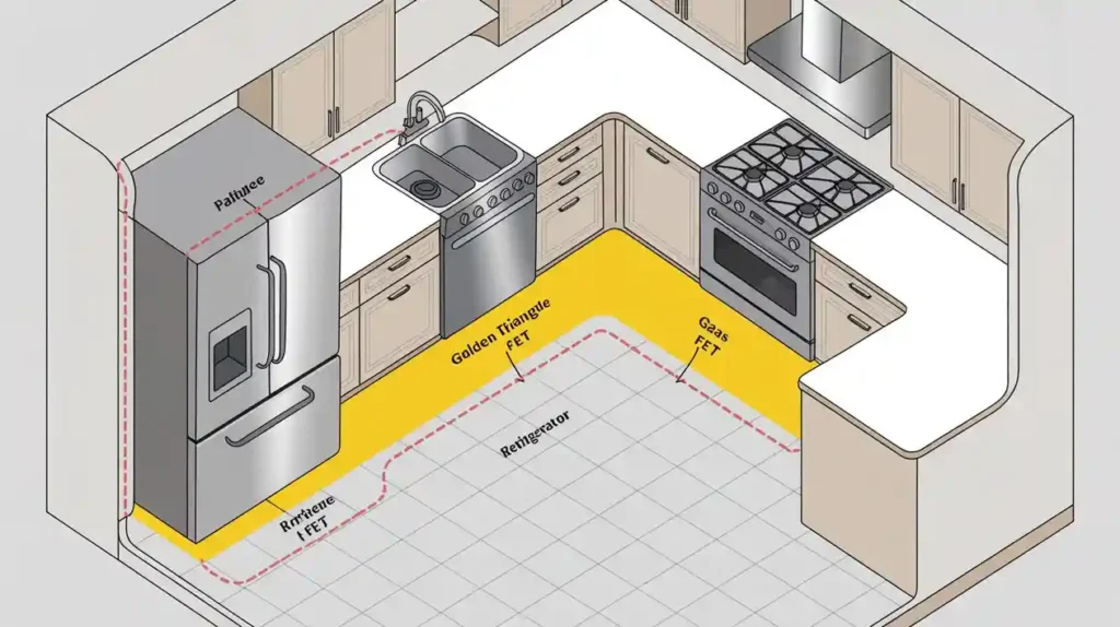 The kitchen triangle, often called the kitchen work triangle or cooking triangle, is a design concept that organizes your kitchen’s three main work zones: the sink (cleaning), the refrigerator (storage), and the stove (cooking). These form the fridge sink stove triangle, connected by imaginary lines that create a triangular workflow. The goal? To let you move smoothly between tasks without wasted steps or obstacles, like a dancer gliding across a stage.